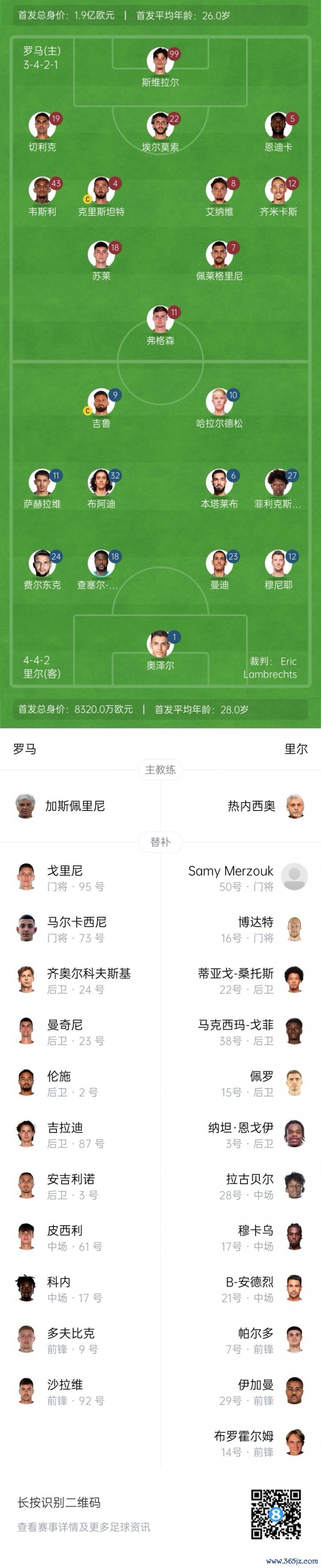 罗马首发:99-斯维拉尔、19-切利克、22-埃尔莫索、5-恩迪卡、43-韦斯利、4-克里斯坦特、8-艾纳维、12-皆米卡斯、7-佩莱格里尼、18-苏莱、11-埃文·弗格森