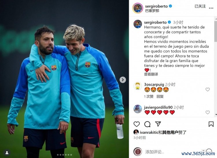 10月8日讯 西班牙边卫阿尔巴将在本赛季甩掉后退役,前巴萨队友罗贝托社媒发文祝贺。