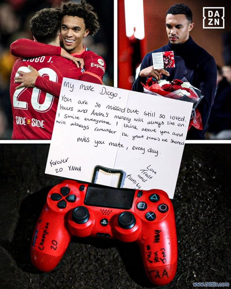 11月4日讯 英格兰右后卫阿诺德本轮欧冠随皇马客战老东家利物浦,赛前,阿诺德在前队友若塔的操心碑前留住卡片。