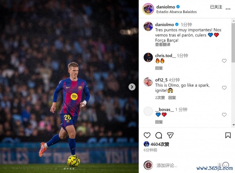 奥尔莫社媒晒出比赛像片,配文:“超过迫切的三分,巴萨球迷们,我们休赛期之后见,加油巴萨!”