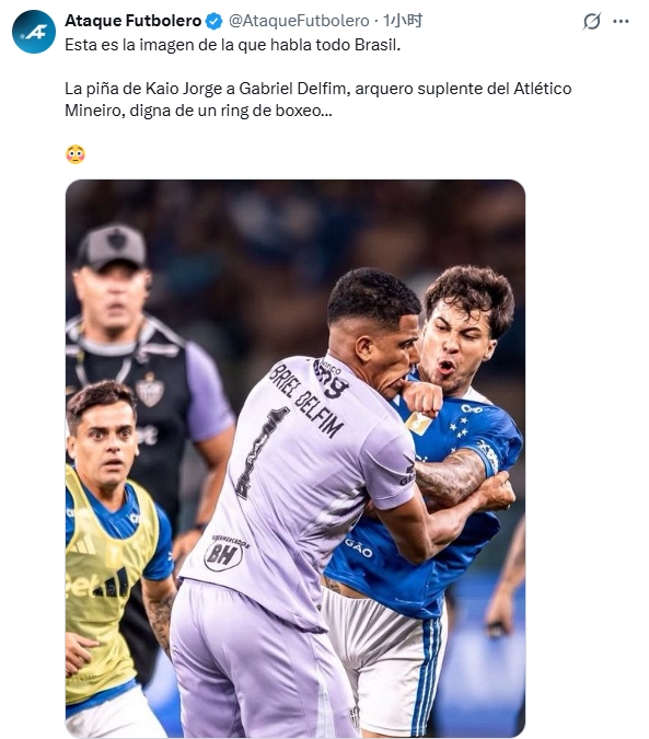 在冲突中,克鲁塞罗射门进球手若热先是跳起飞踢对手,跟上作势踢了一脚。随后边跑边拳打米内罗竞技替代队员球门守卫德尔芬姆。