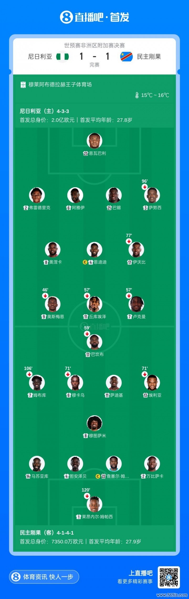 11月17日讯 世初赛非洲区附加赛决赛,尼日利亚点球大战不敌民主刚果,勾通两届无缘全国杯。比赛中,尼日利亚主帅的换东说念主操作激勉热议。