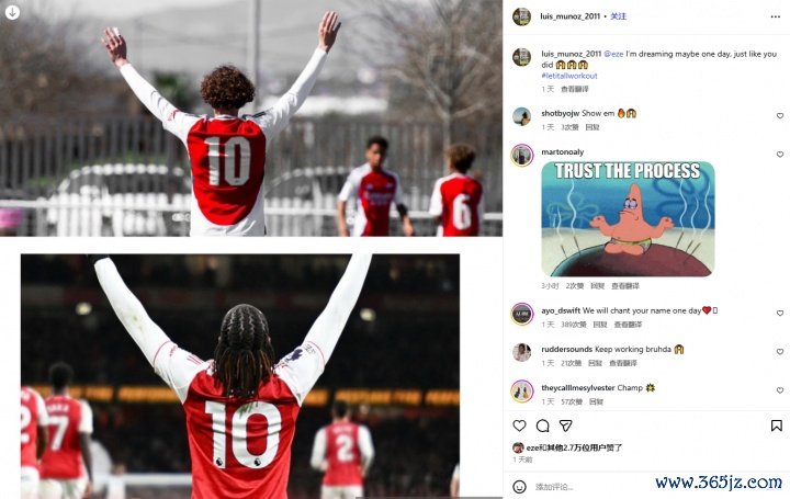 阿森纳青训小将Luis Muñoz在社媒发布了我方和埃泽身穿10号球衣庆祝的相片,配文:@埃泽 我梦念念着有一天,不详也能像你雷同🙌🙌🙌#letitallworkout