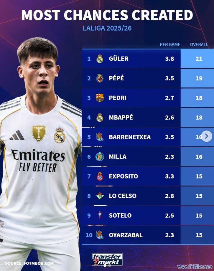 9月30日讯 德转清点了本赛季西甲创造契机榜单,其中居勒尔野心21次创造契机居首,具体如下(场均数据+总和据):