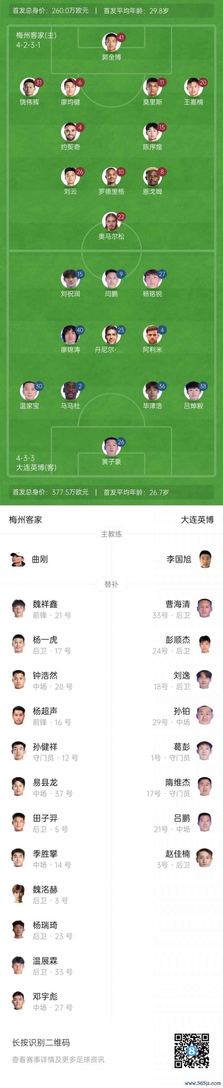 梅州客家5胜5平18负积20分,排行中超第15;大连英博9胜8平11负积35分,排行中超第11。