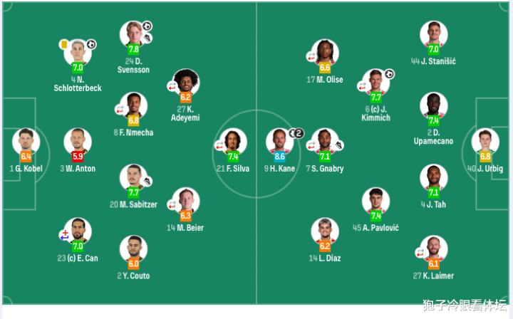 拜仁慕尼黑首发阵容:40-乌尔比希、2-于帕梅卡诺、4-塔、44-斯坦尼西奇、45-帕夫洛维奇、6-基米希(90’8-格雷茨卡)、7-格纳布里(62’10-穆西亚拉)、27-莱默尔(90’20-比朔夫)、14-迪亚斯、17-奥利塞(90’3-金玟哉)、9-凯恩。