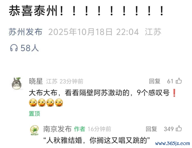 “梗”的存在感,莫得随着一轮轮比赛的鞭策和队伍的不竭淘汰而变淡。省会南京憾负泰州、停步四强时,连八强都没进的“全省GDP扛把子”苏州,在官方宣传时连打九个惊叹号:“恭喜泰州!!!!!!!!!”而近邻南京被问及怎样看待苏州此举时,浅浅地援用了一句影视台词顽抗——“东说念主秋雅成婚,你搁这又唱又跳的”。固然其后这句话删掉了,但网友照旧感叹:这才是阿谁熟悉的散装江苏。
